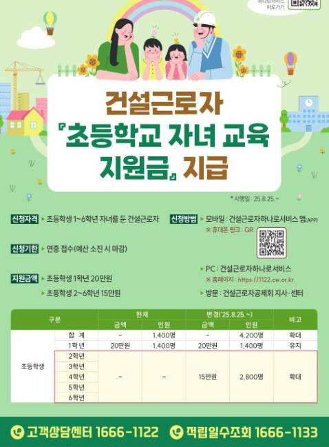 - 지원 대상: 초등학생 자녀를 둔 건설 노동자
