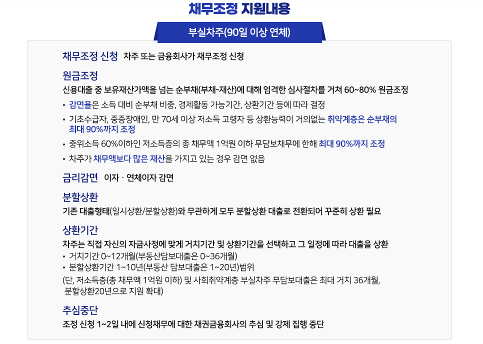 - 대상 확인 → 상담 및 채무조정 신청 → 감면율·상환기간 등 맞춤형 채무조정안 제시 → 약정 체결 및 실행